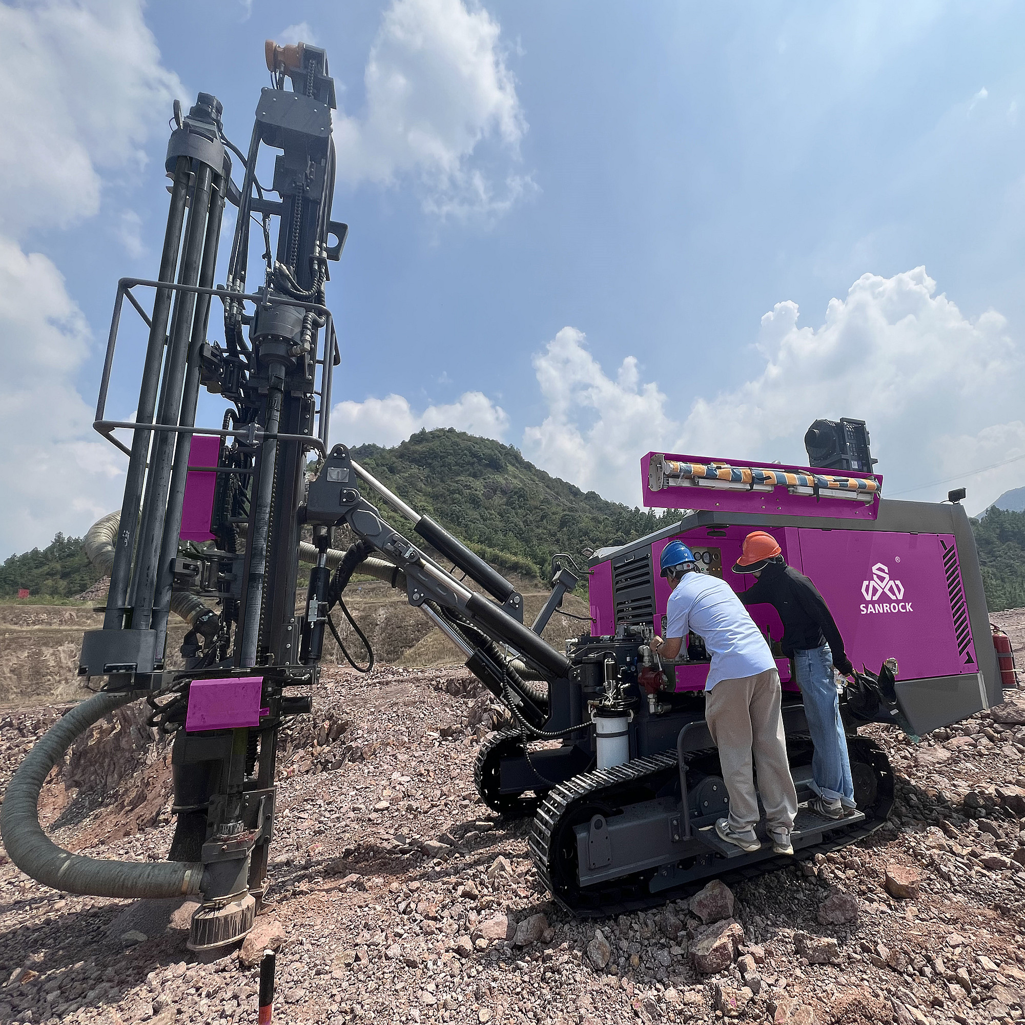 The drilling rig is characterized by excellent integrity and compact design structure. Optional installation of automatic rod change,configuration dry dust collectors environmental protection. High degree of automation, efficient drilling, simple operation, flexible maneuverability, single operator for labor cost. Sanrock automatic drilling rig with rod changing system, powerful feeding and rotation design for less jamming in complex rock situation,hefficient High efficiency drilling speed. Can easily cope with all kinds of drilling angel requirement of landscapes. The advantageous functions such as precise boom positioning,automatic rod handling.